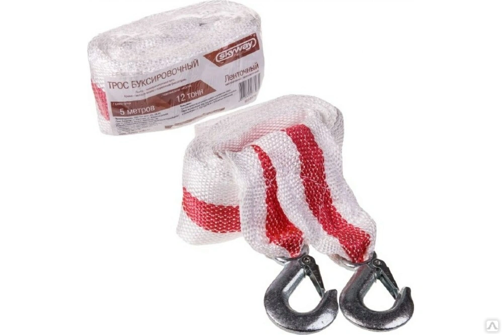 Трос буксировочный ленточный 12т 5м 2 крюка (пакет) SKYWAY