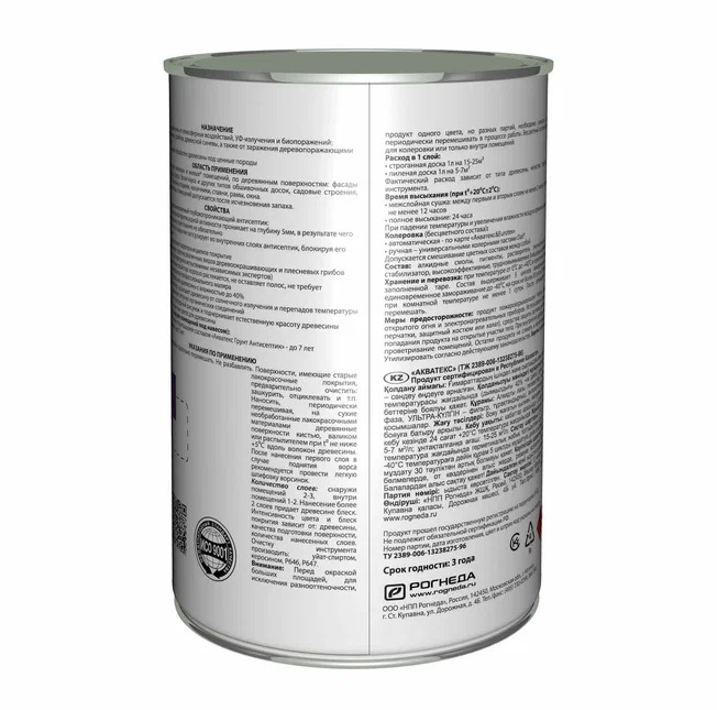 Состав алкидные смолы, нефрас, эмульсионная фаза, высокоэффективные трудновымываемые биоцидные добавки, светостойкие пигменты, УФ-фильтр UVA-диапазона, стабилизатор