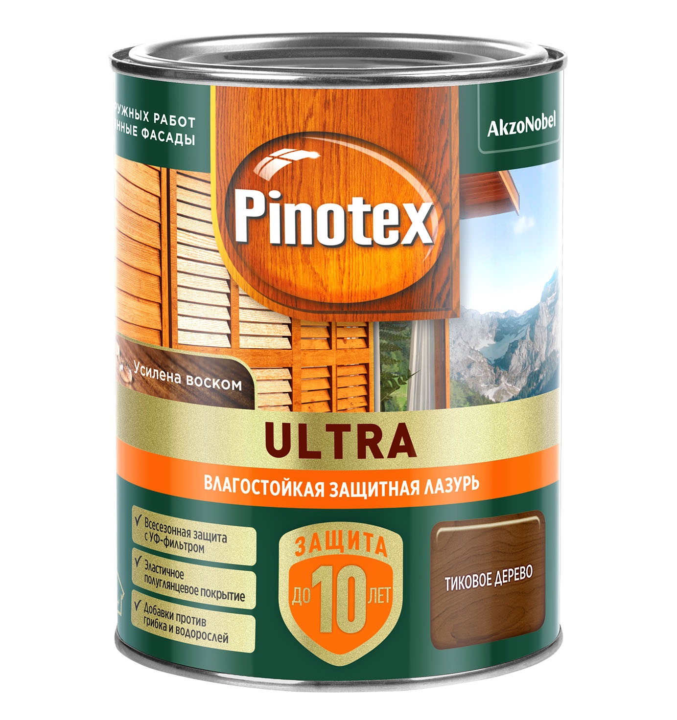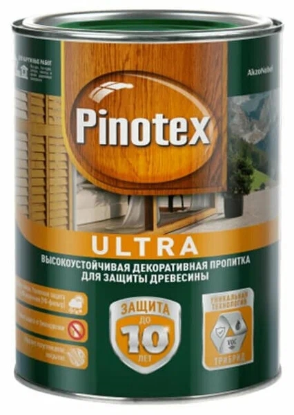 Пинотекс Ультра является хорошим средством для надежной защиты древесины снаружи от плесени, синевы, грибков гнили, негативного воздействия воды, солнца и ветра и привлекательно смотрится на стенах домов, заборах, беседках, хозпостройках и других наружных деревянных конструкциях. Пинотекс Ультра не допускается использовать для обработки внутренних поверхностей. Пинотекс Ультра содержит специальный УФ-фильтр, который придает поверхности большую стойкость к выгоранию. Пинотекс Ультра впитывается в древесину и не образует сплошной пленки.