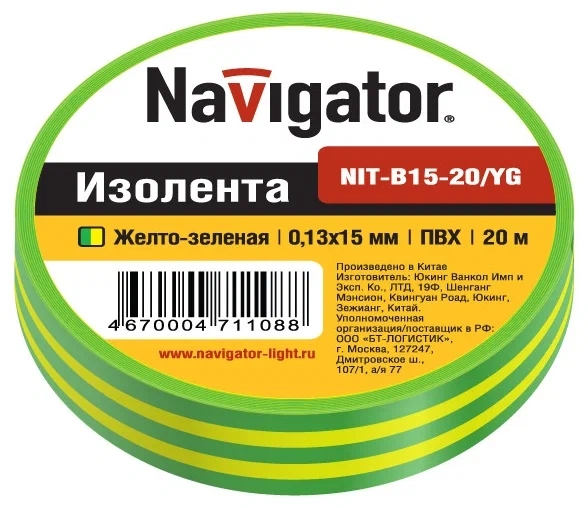 - Изолента Navigator ПВХ 15мм*20м Жёлто-зеленая
