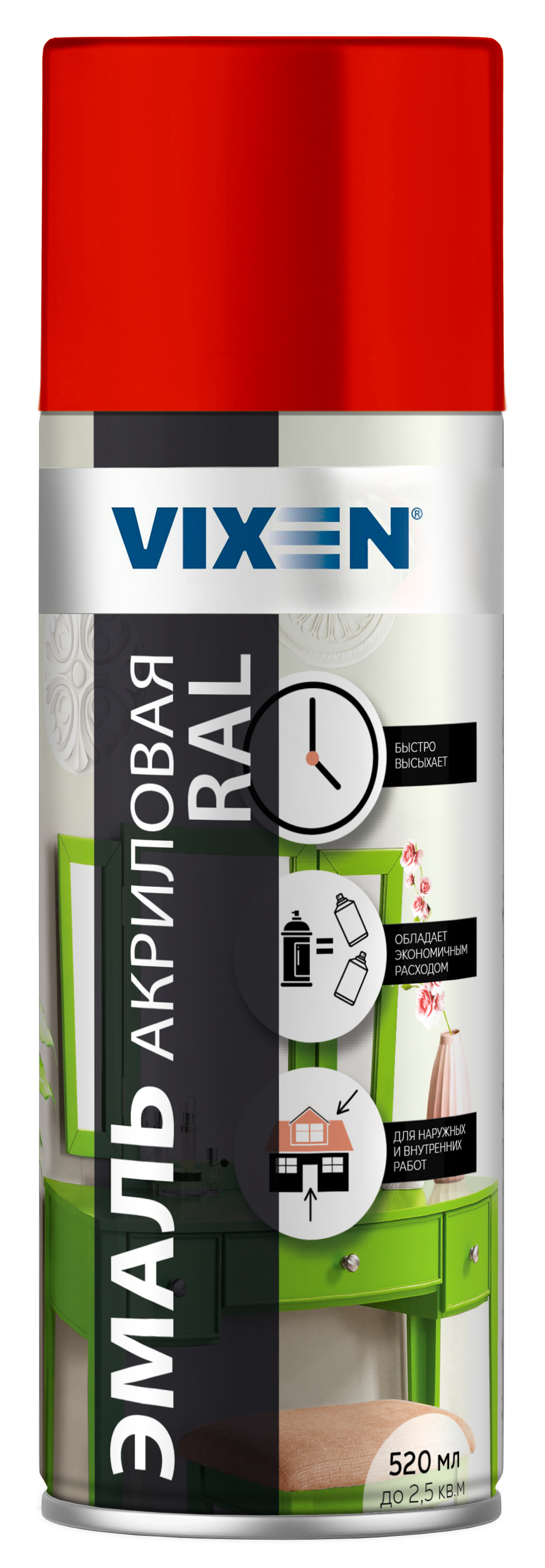 Эмаль аэрозольная VIXEN акриловая RAL 3020 "транспортный красный" 520мл, VX-13020