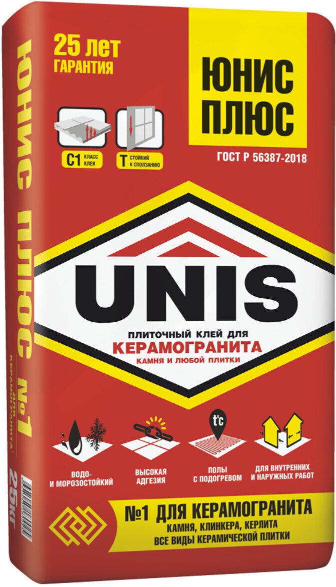 Юнис-Плюс - Клей для укладки керамической плитки и плитки из природного камня. Используется для укладки керамической, кафельной и мозаичной плитки, плитки из природного камня на пол и стены. Максимальный вес приклеиваемой плитки не более 500 грамм на каждые 100см² поверхности плиты. Рекомендуется для работ по сложным основаниям: старым плиточным покрытиям, нагреваемым поверхностям, системам «Тёплый пол».