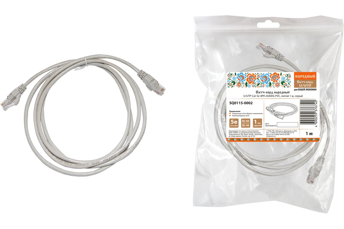 Патч-корд народный U/UTP Cat 5e 4PR 24AWG PVC, литой 1,5м, серый