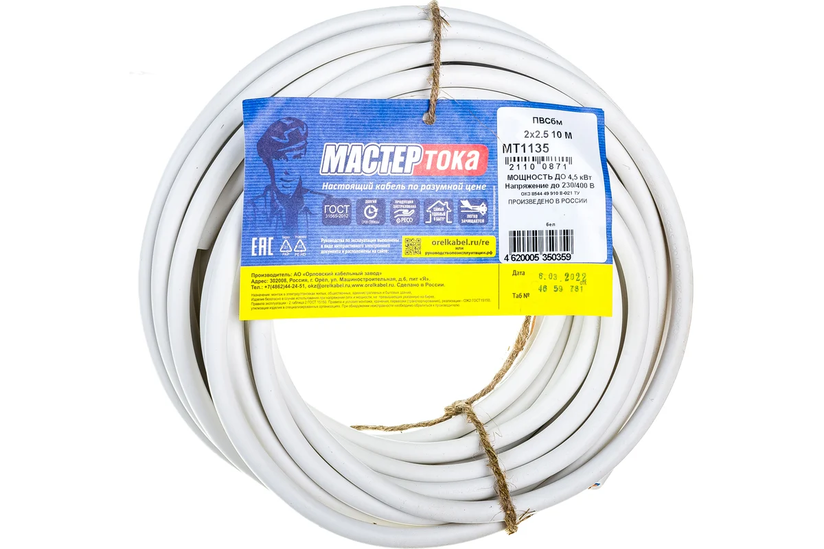 Провод ПВСбм 2Х2.5 бел 10м Мастер Тока ТУ